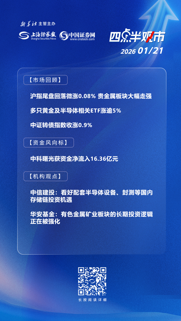 1月21日,A股呈现冲高回落走势,尾盘大金融和大消费板块震荡调整,拖累沪指一度翻绿。截至收盘,上证指数报4116.94点,涨0.08%;深证成指涨0.70%,创业板指涨0.54%,科创综指涨2.32%。沪深两市合计成交2.6万亿元,较前一日缩量1771亿元。