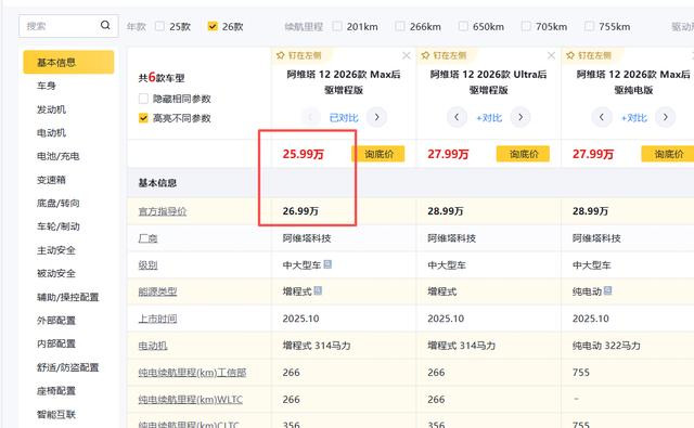 2025 年 10 月 18 号阿维塔12 四激光版开启预售,10 天后就正式上市了,速度还挺快。这次一共出了 6 个版本五八策略,有纯电也有增程,指导价从 26.99 万到 42.99 万,叠加权益后到手价 25.99 万起,比指导价便宜 1 万。近期我去 4S 店试驾了两次,还借朋友的车开了三天,很大的感受是 “这台车没玩虚的”—— 全系都带四激光雷达,增程版电池也加大了,好多豪华配置都是标配。作为每天要跑通勤、周末带家人出门的普通车主,我更关心这些配置是不是真的好用,今天就用大白话唠唠真实体验。