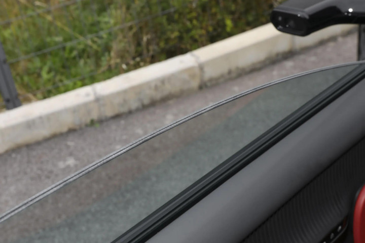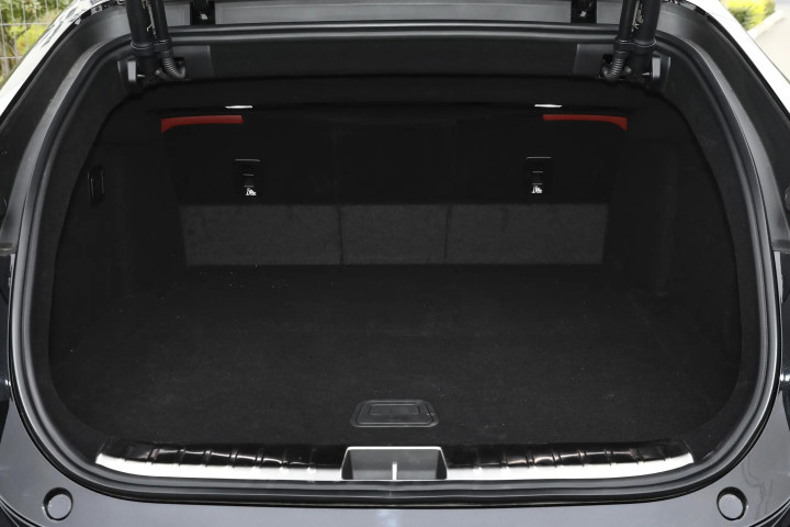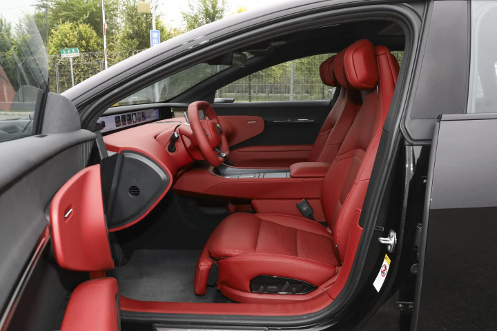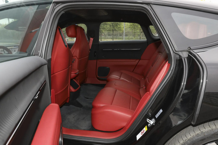 车身线条很顺,Fastback 溜背造型看着运动,风阻也小。无边框车门是全系标配,按一下车门会自动弹开一点,上车的时候不用使劲拉,仪式感挺足。隐藏式门把手也是标配,锁车的时候会缩进去,不沾灰也好看。19 英寸的低风阻轮毂,配红色四活塞卡钳(选装的),运动感一下就出来了。