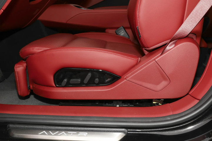阿维塔12 的车身尺寸是 5020mm×1999mm×1450mm,轴距 3020mm,典型的中大型轿跑身材,但空间一点都不挤。我身高 185cm,调整好前排驾驶位后,头部还有 1 拳左右的空间,不会蹭到车顶。腿部空间也够,座椅调到很低,膝盖不会顶到中控台。