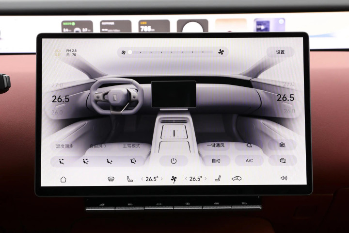中控台是环抱式的,往驾驶座倾斜了一点,操作的时候不用伸老远,很顺手。显眼的是那块 35.4 英寸的 4K 一体远端屏,从主驾一直铺到副驾,清晰度非常高,太阳底下也不反光。仪表盘、导航、音乐信息都在上面显示,分区很清楚,开车的时候不用频繁低头,安全多了。中间悬浮着 15.6 英寸的中控屏,触摸反应很快,没有卡顿。