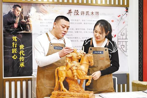 12月11日,许红阳和妻子在交流木雕技艺。河北日报记者 赵永辉摄