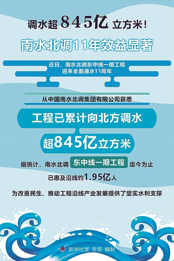 近日,南水北调东中线一期工程迎来全面通水11周年。记者从中国南水北调集团有限公司获悉,工程已累计向北方调水超845亿立方米。
